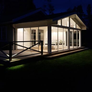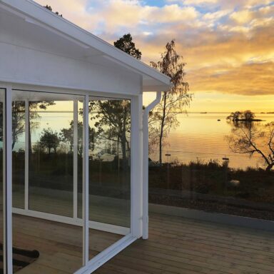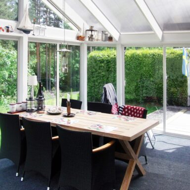 Primolux Sommer er et hagestuesystem for å forlenge sommeren. Den leveres i stilig hvit aluminium med 5 mm herdet sikkerhetsglass.