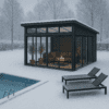 Set med limtrereisverk, tak og skyveseksjoner tilpasset frittstående montering.