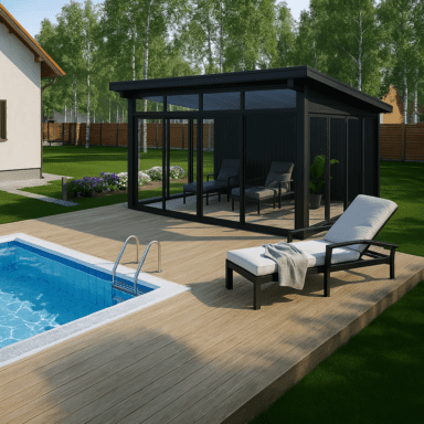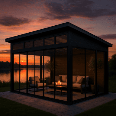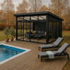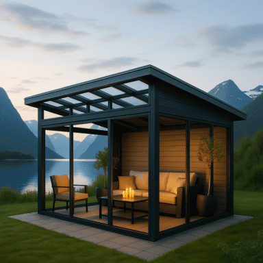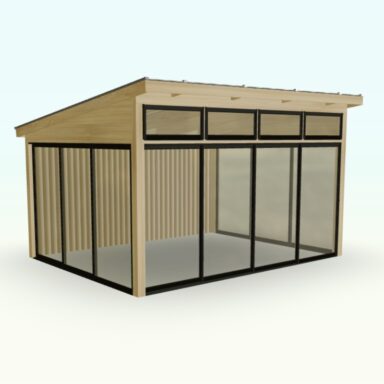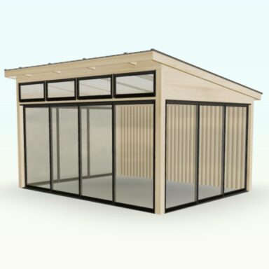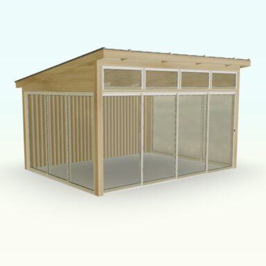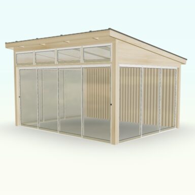 Set med limtrereisverk, tak og skyveseksjoner tilpasset frittstående montering.