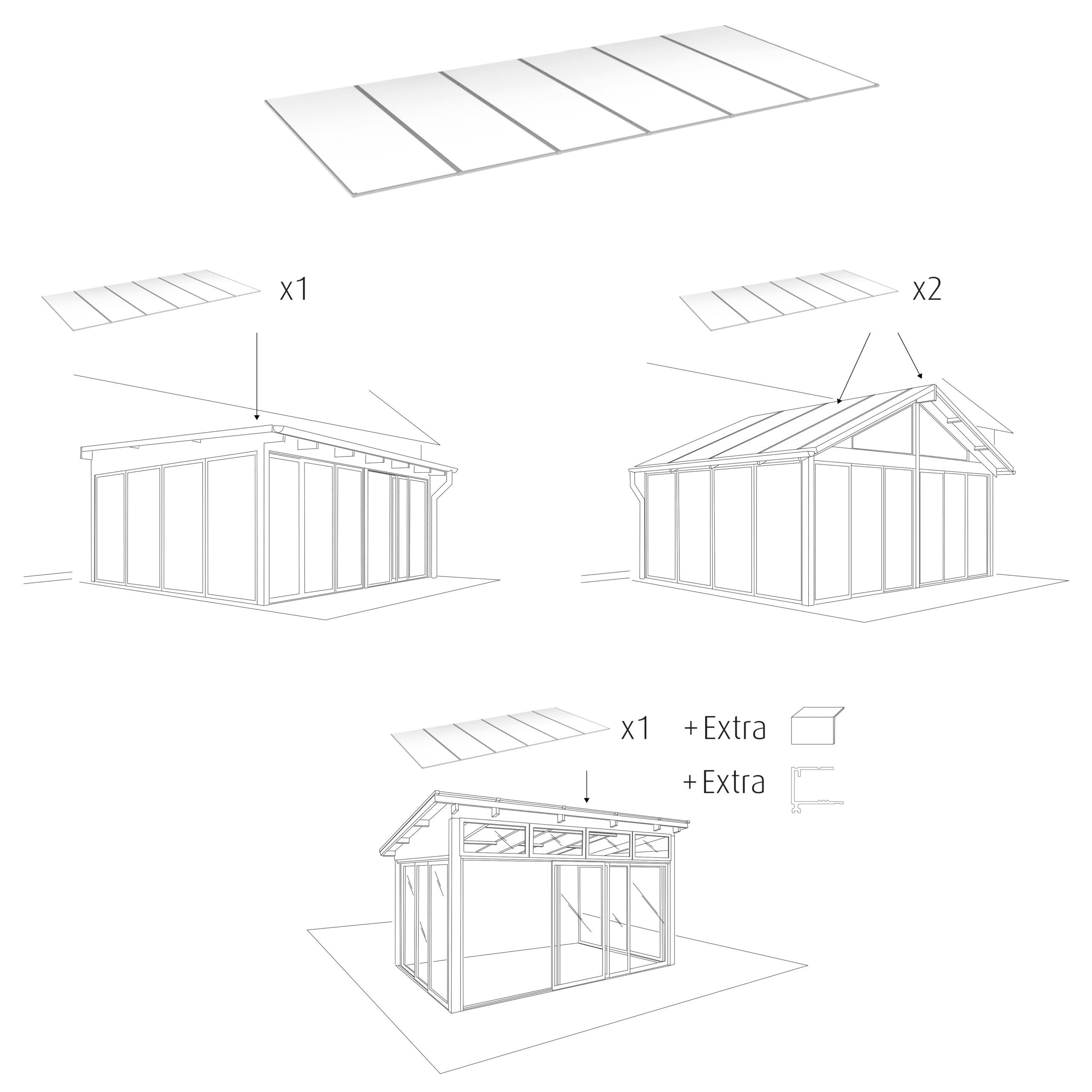 Våre komplette tak er tilpasset installasjon mot husfasader. Frittstående vinterhager og frittstående takkonstruksjoner suppleres med endeprofiler og endelokk i bakkant.